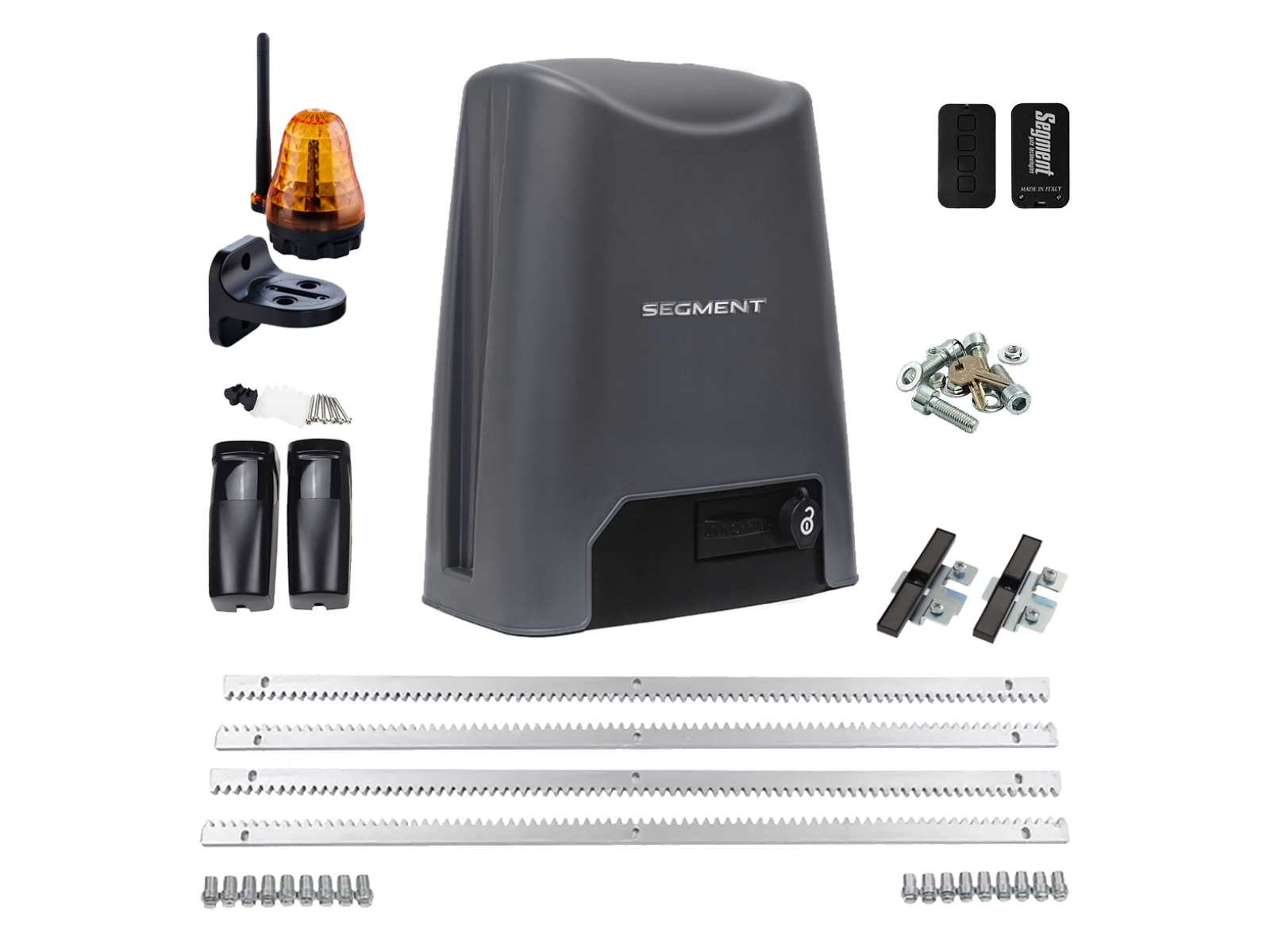 Привід італійської автоматики для воріт Segment ставитися до класу не дорогої автоматики для воріт. Основний елемент у приводі, на якій припадає максимальне робоче навантаження – двигун. Він у цих системах італійський та здатний тривалий час відпрацювати без необхідності поточного ремонту. Допоміжні, другорядні елементи у цих комплектах зібрані у Китаї. Це пульти та фотоелементи, а також лампа. Завдяки такій комплектації досягається відносно низька ціна комплекту автоматики на відкатні ворота Segment.