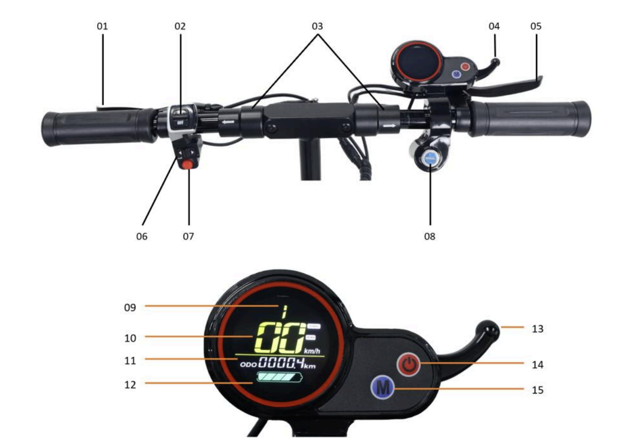 01. Ручка гальма, 02. Вимикач переднього світла, 03. Фіксатори ручки, 04. Акселератор, 05. Ручка гальма, 06. Перемикач покажчика повороту, 07. Звуковий сигнал, 08. Електричний замок, 01. Передача, 1. Передача, 1. Рівень заряду акумулятора, 13. Акселератор, 14. Кнопка живлення, 15. Перемикання передачі.