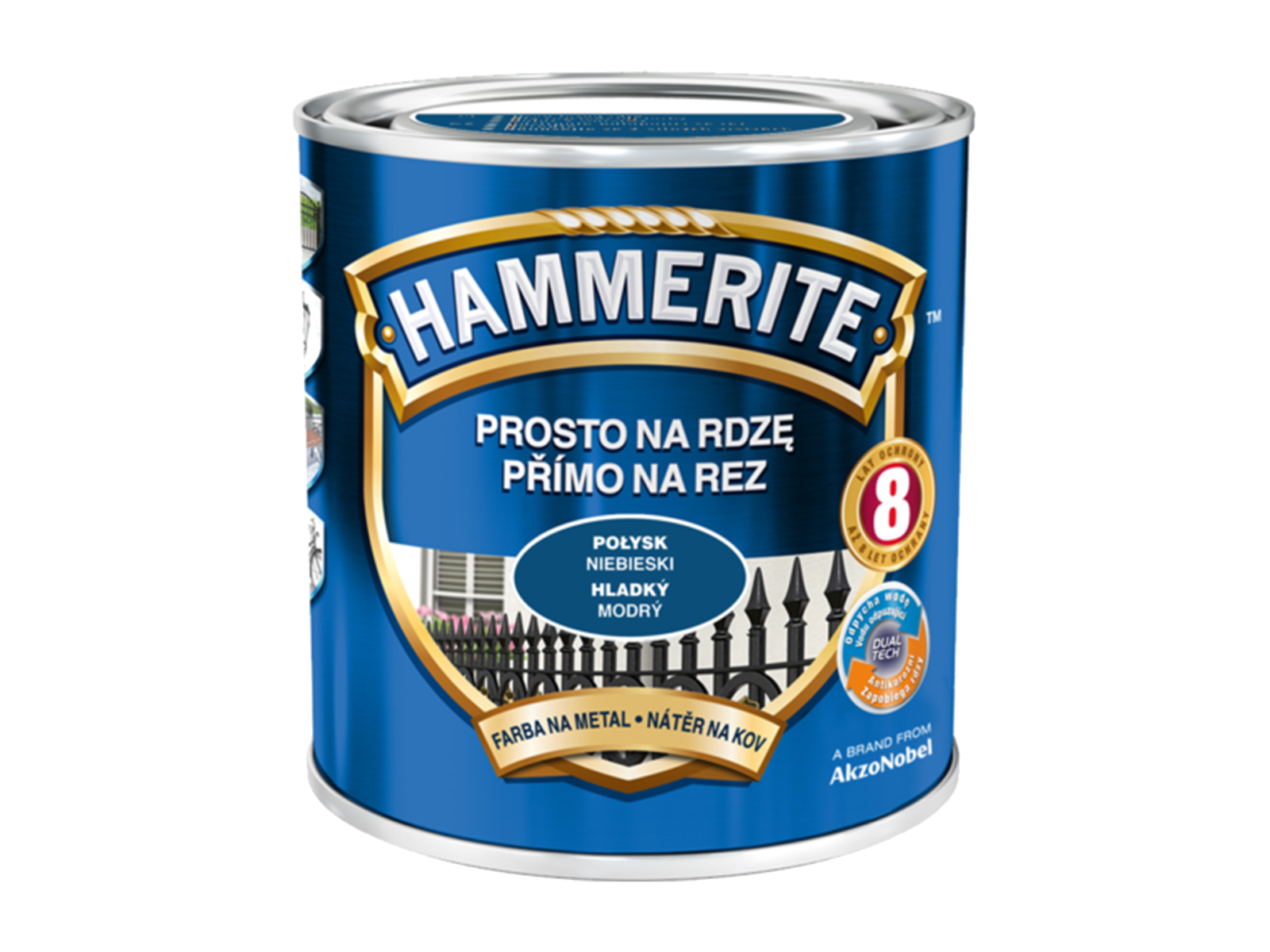 Фінішна гладка швидкосохнуча емаль по іржі Hammerite Smooth, має у своєму складі антикорозійні та силіконові добавки. Застосовується для кольорових та чорних металів, наноситься прямо по іржі. Фарба вільно наноситься та гарантує міцне антикорозійне покриття та ефективний захист від іржі протягом 8 років. Можна застосовувати для обробки дерева та пластику.