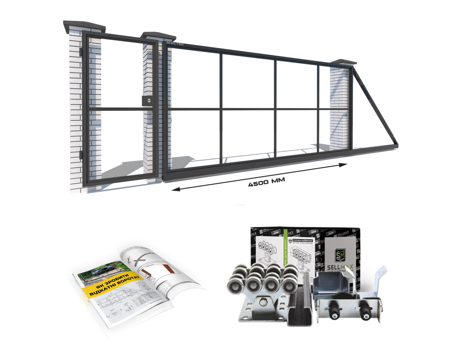 Каркас відкатних воріт з Т-профілю на проєм 4,5 метра, довжина воріт 7 метрів, з хвірткою, що окремо стоїть.