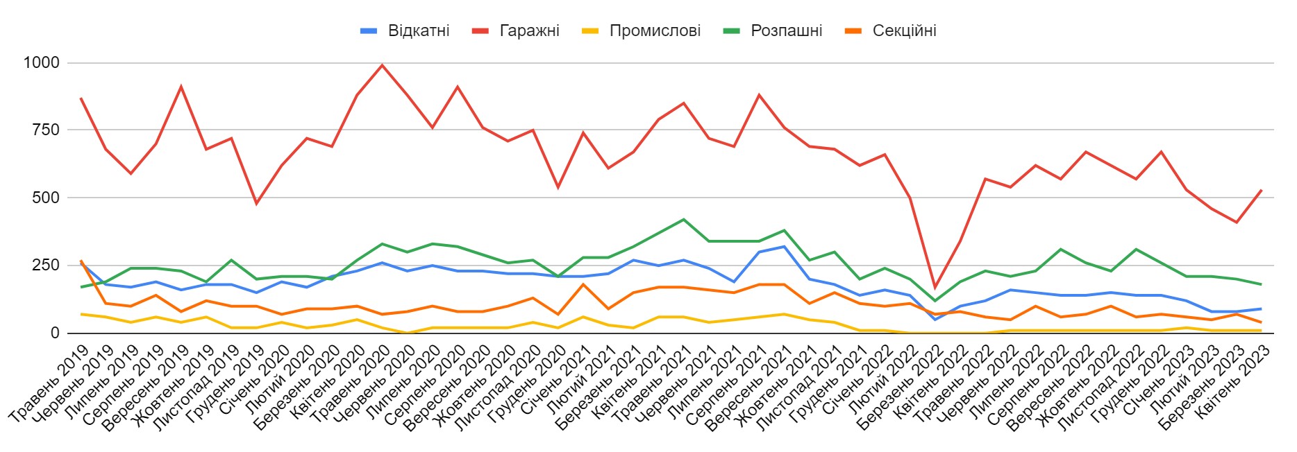 Рис.7. Динаміка онлайн-попиту на різновиди воріт, травень 2019 - квітень 2023