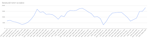 Кожної зими попит на навіси просідає. Та навіть попри війну користувачі продовжили цікавитись навісами взимку 2022-2023. Кількість запитів була не набагато меншою в порівнянні з тими ж періодами в 2020-2021 рр.