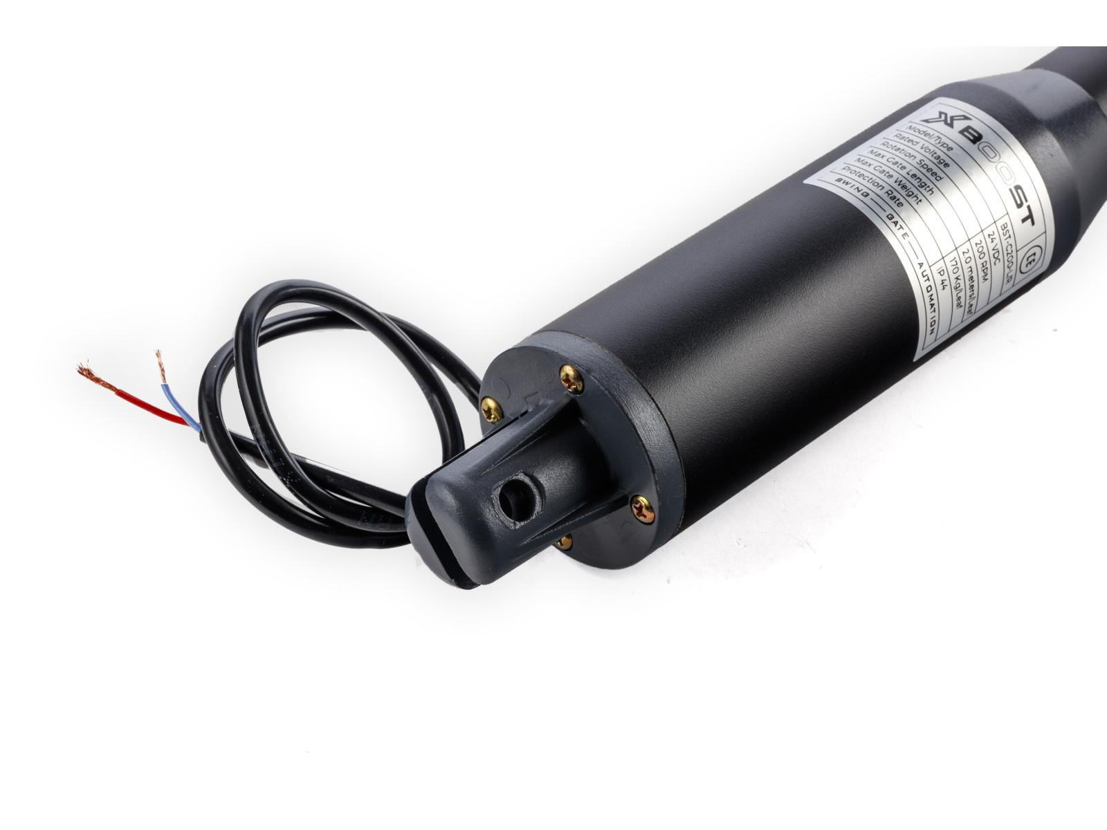 Распашная автоматика X-BOOST C200 оснащена низкооборотистыми электромоторами с питанием переменным током 24 В. Конструкция рассчитана на эксплуатацию в наших широтах в температурных диапазонах от -20 до +50 градусов, и имеет защиту класса IP 54. Механизм рассчитан на оснащение ворот со створкой длиной до 1.5 м и весом каждой до 200 кг., и эксплуатацией не более 40%. Формат реализации - раздельный, с отдельным блоком управления и радиоприемником в прочном защищенном пластиковом корпусе.