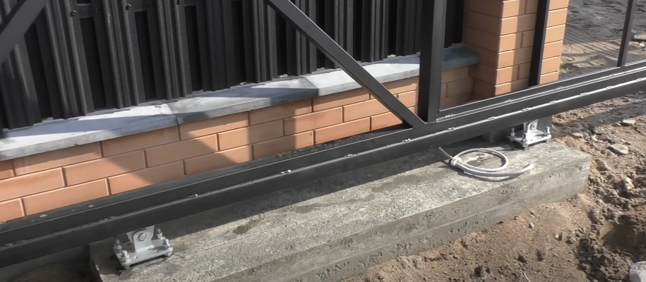 После застывания фундамента монтируют направляющую, крепя ее на анкеры или болты. Она должна быть ровной, без перекосов. Далее на створку ворот устанавливают ролики и кронштейны. Ролики крепят с учетом зазоров, чтобы ворота не цеплялись и не шатались во время движения.