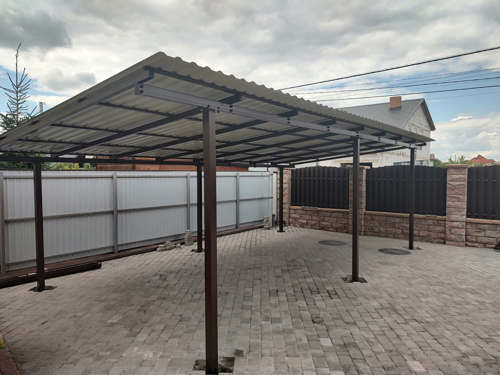 - минимальный скат крыши из профнастила составляет 8°, максимальный 20°. Оптимально делать навес под 12°;