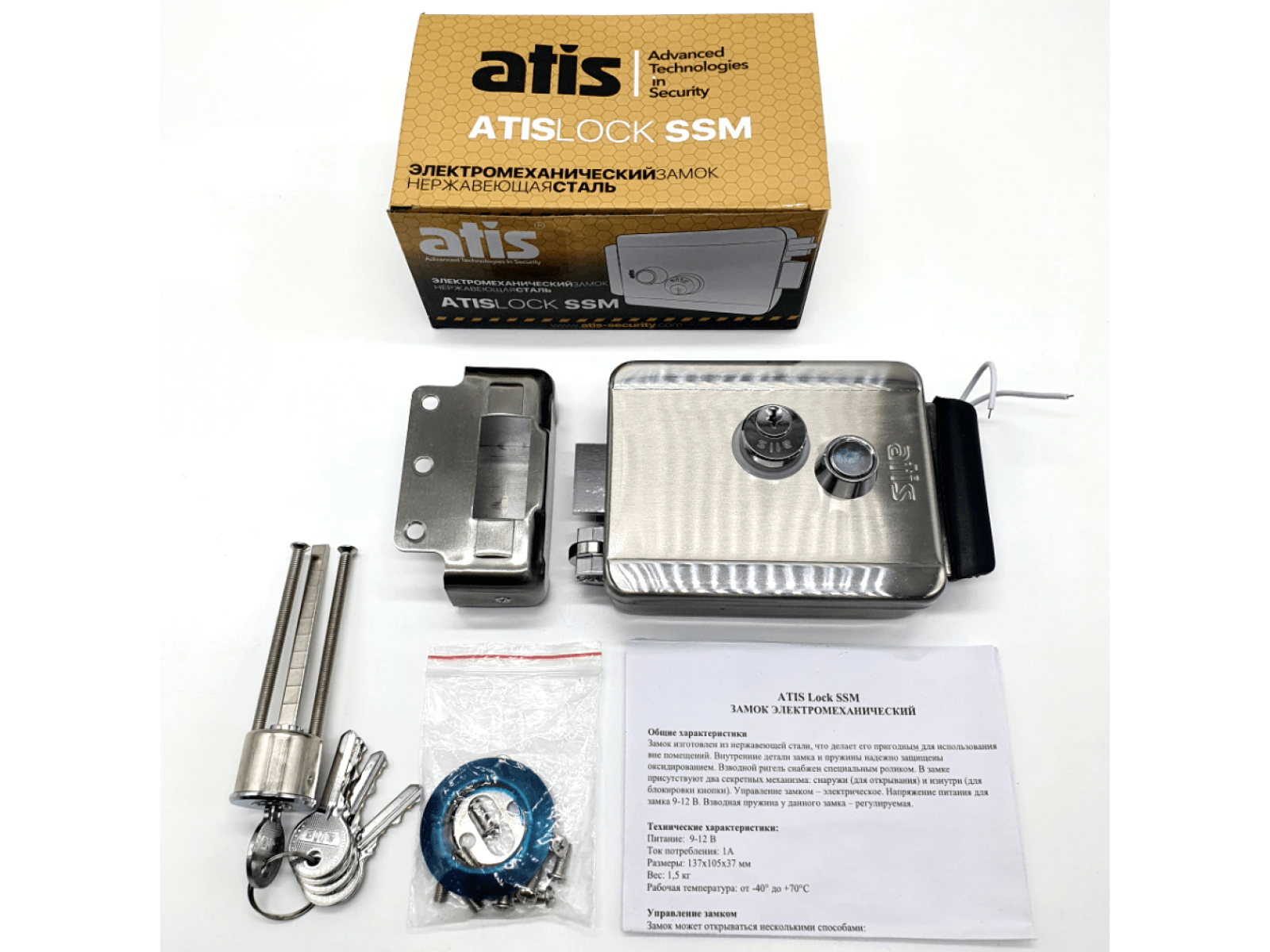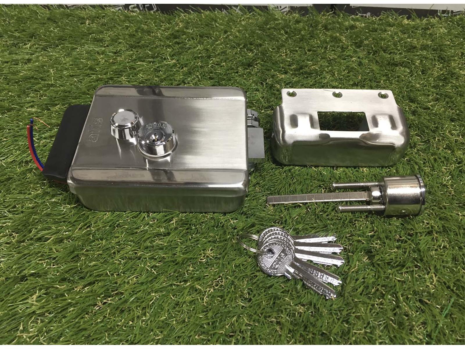 Компанія Atis виробляє електромеханічні замки накладного типу, призначені для установки на ворота і хвіртки з металу. Конструкція моделі Lock SS об'єднує класичний механічний запір і електропривод, який дозволяє відкривати замок дистанційно. Відкривання можливе за допомогою пульта, кнопки, домофона, контролера доступу або іншого керуючого пристрою.